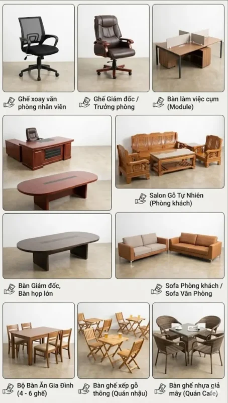 | Loại Bàn Ghế Cần Thu Mua | Chất Liệu / Tình Trạng Điển Hình | Khoảng Giá Thu Mua (VNĐ) |