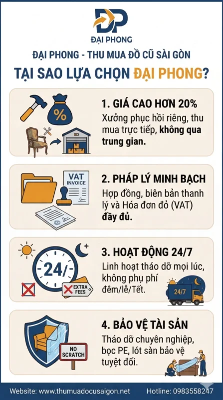 Thị trường đồ cũ có vô vàn cá nhân mua bán nhỏ lẻ (những người đẩy xe ba gác, thu mua phế liệu), nhưng để giải quyết bài toán thanh lý nội thất chuyên nghiệp, bạn cần một đối tác thực thụ vì những lý do sau: